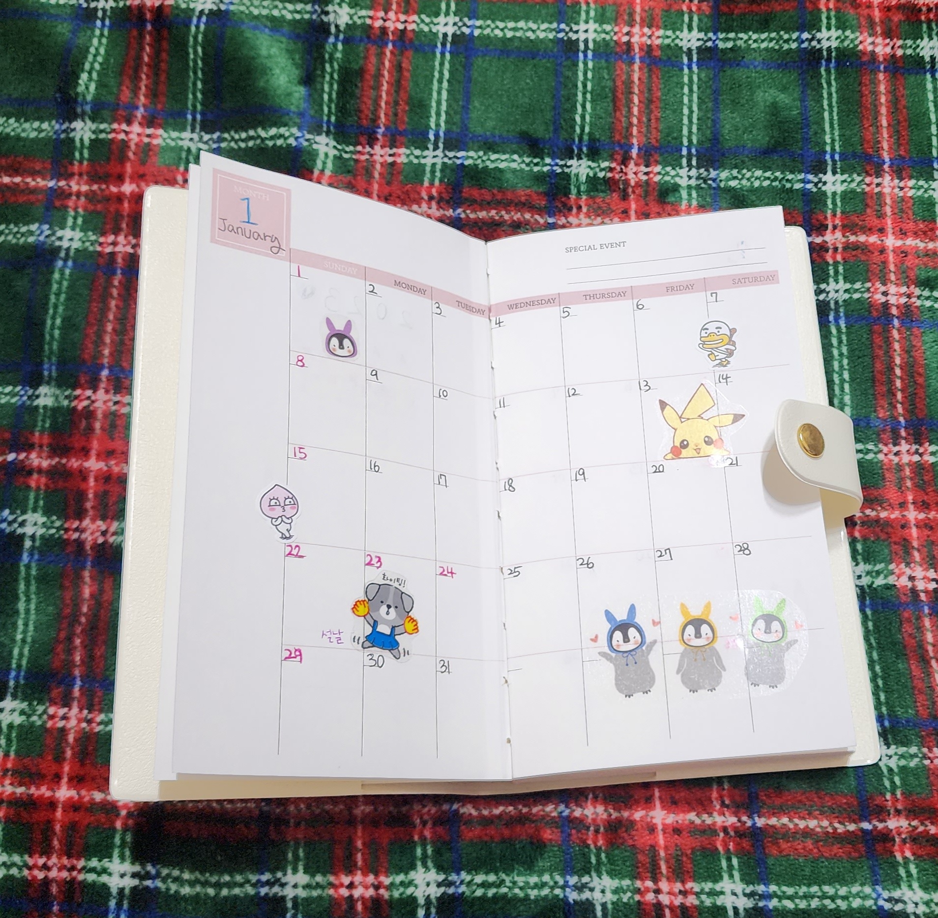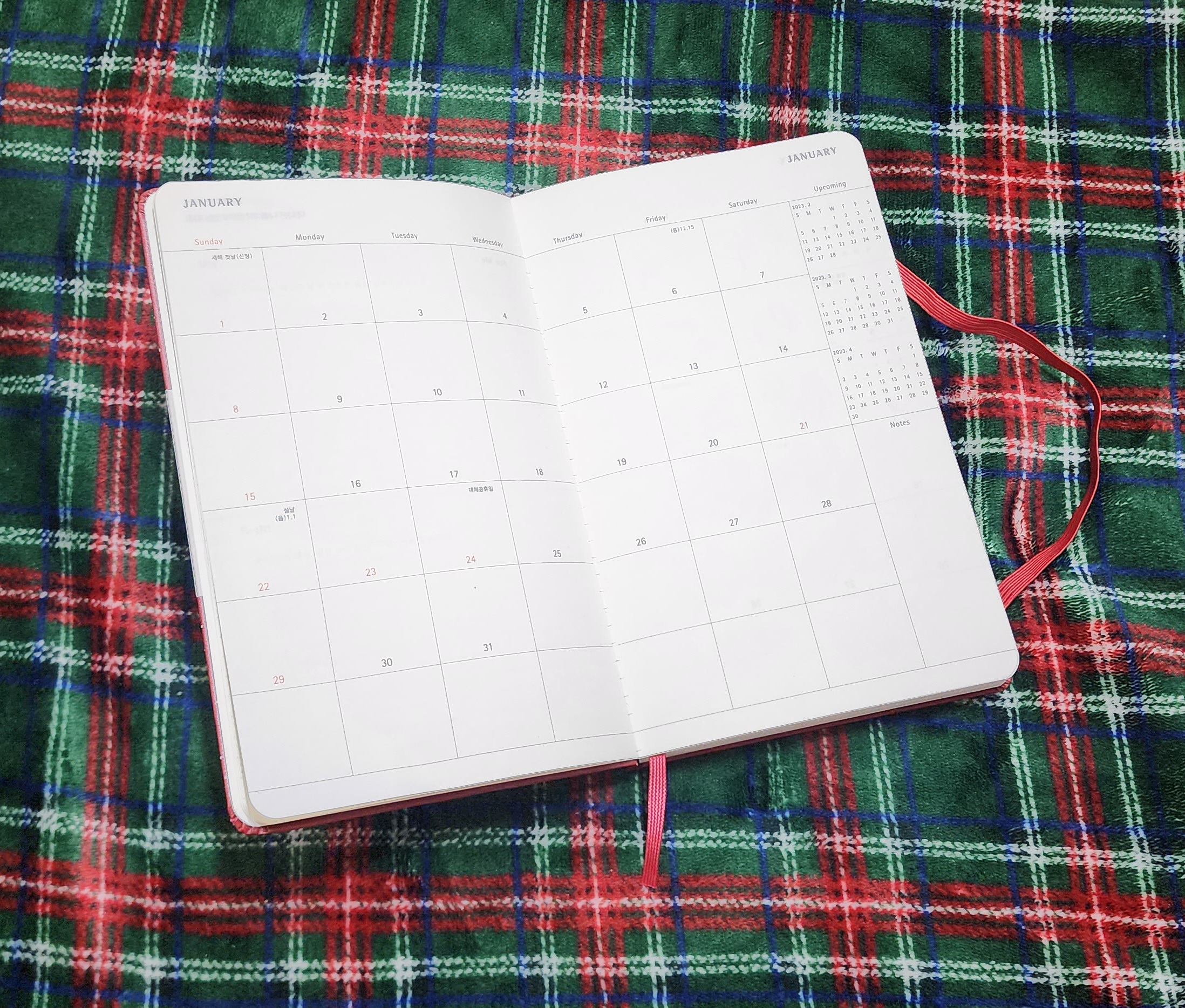 1월부터 12월까지 월별로 표시되어 있고, 주간도 모두 날짜가 함께 표기되어 있습니다. 상대적으로 무지노트는 양이 적게