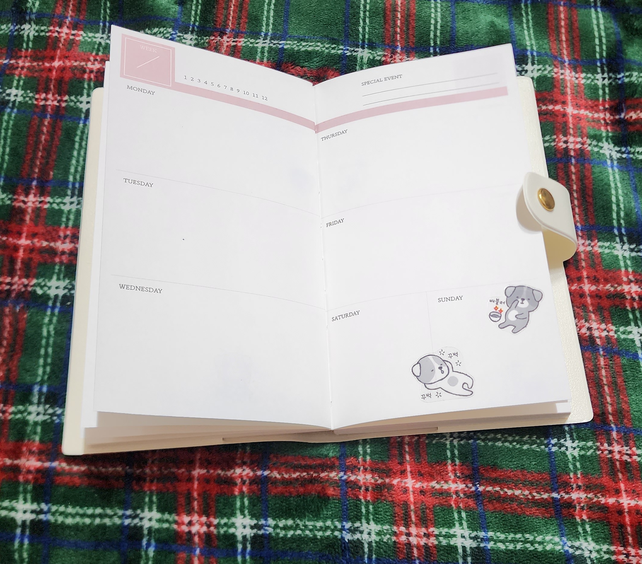 날짜가 따로 기입되어 있지 않아서 직접 적어가면서 써야 합니다. 월별 부분이 13개월로 되어 있습니다. 2022년 12월부터 작성해서 사용도 가능합니자. 하지만 저는 그걸 2023년 1월부터 다 쓰고 발견했습니다. 2024년 1월까지 쓸 수 있을 것 같습니다. 주간표시 부분도 동일하게 적어가며 써야 합니다. 가로줄 노트와 바둑판모양 노트가 함께 소량씩 구성되어 있습니다. 가성비가 좋아서 만족스러운 구매였습니다.