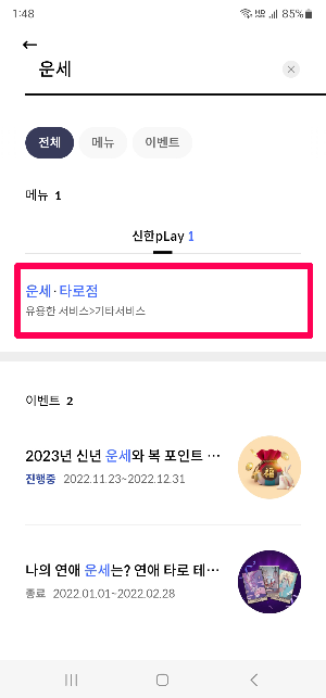 신한플레이 앱 실행 > 혜택 > 검색 > 운세타로점 > 2023 계묘년 신년운세